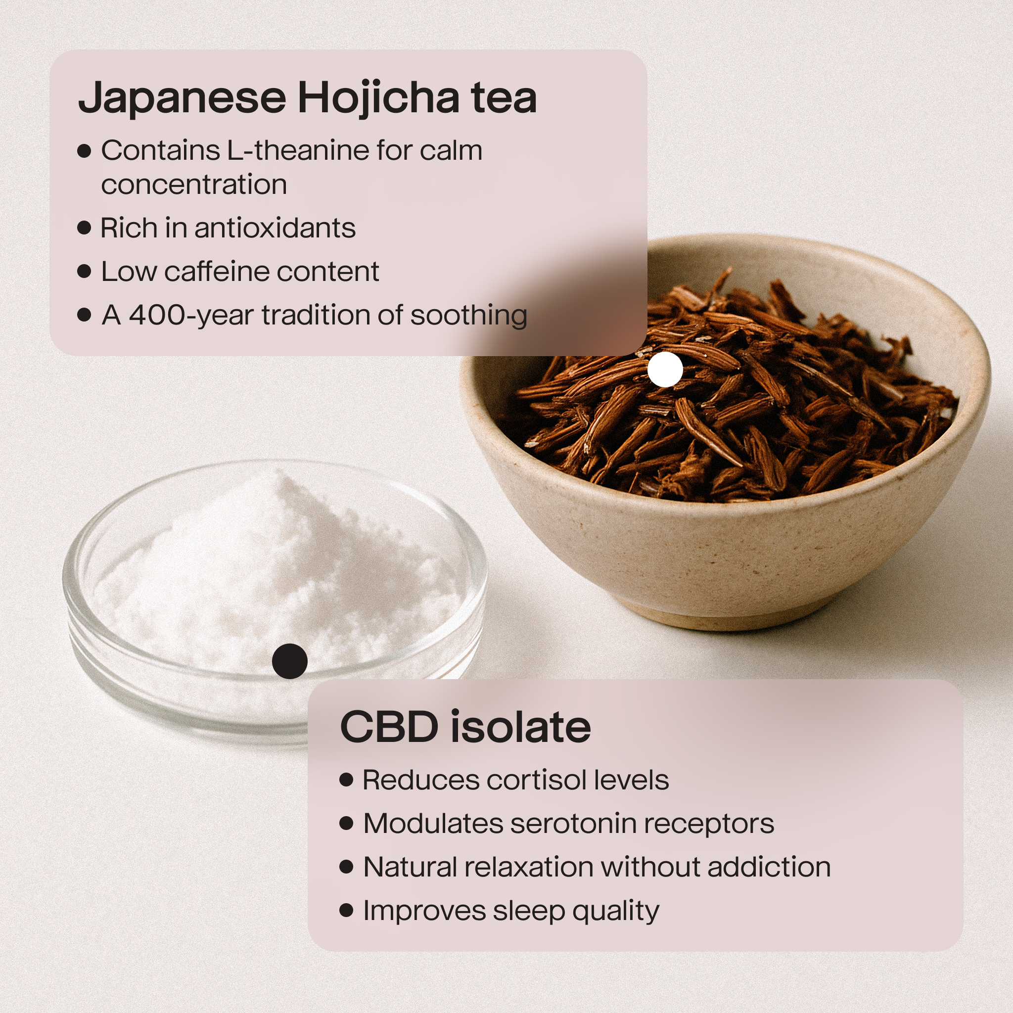 Relieves anxiety | Improves mood CBD modulates serotonin receptors, reducing anxiety levels and stabilizing emotional background. Hojicha additionally calms through natural sedative components.