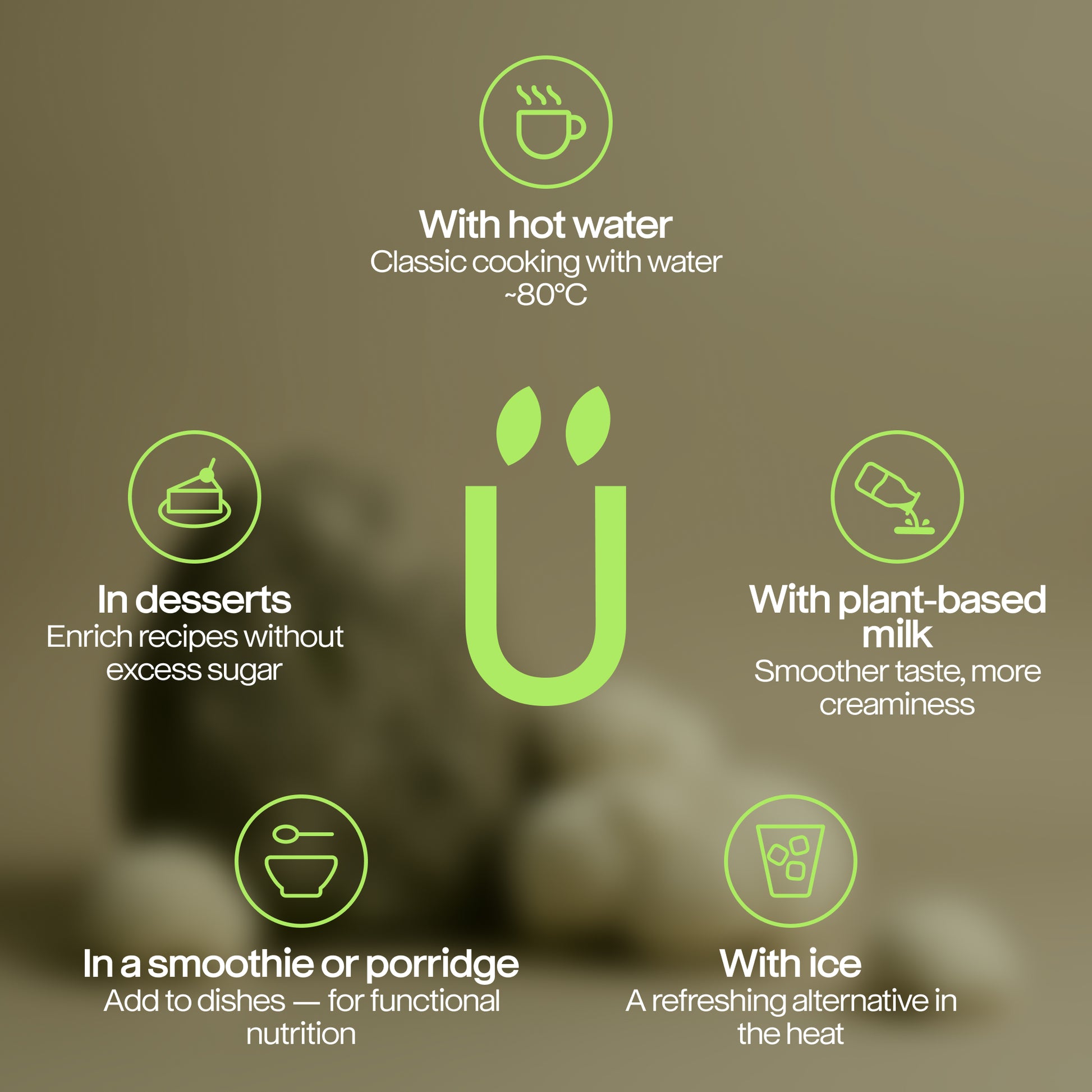 Each serving of our matcha contains the optimal amount of mushroom extracts and premium matcha to deliver a complete functional effect. Thanks to our drying technology, all beneficial properties are preserved in a concentrated form.