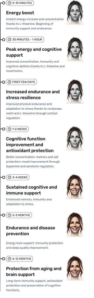 The overall effect of this blend is a stable improvement in energy, clarity of mind, focus, and stress resilience throughout the day. Together, these components address fatigue, lack of concentration, and stress, helping you stay productive and energized.