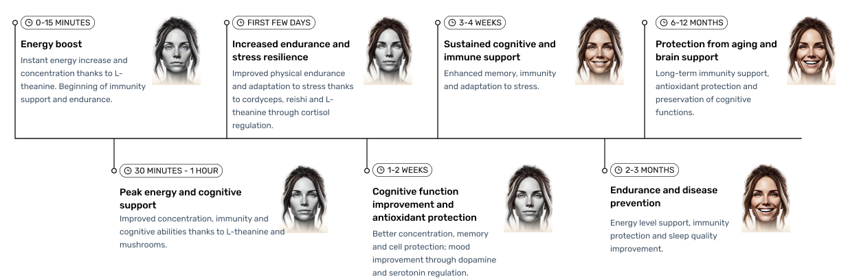Most of our customers notice improved energy levels, concentration, and stress resilience within 1–2 weeks of regular use. For long-lasting results, we recommend enjoying our drinks for 60 days.